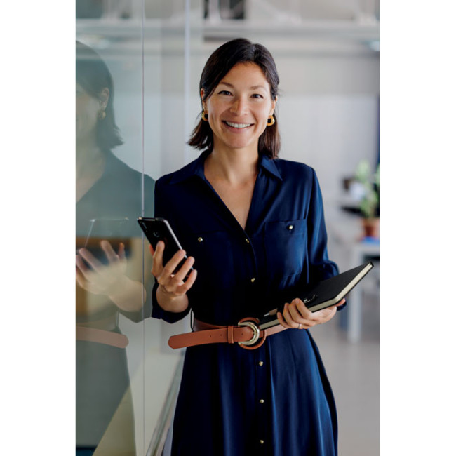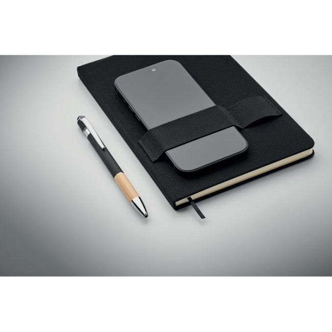 Set di notebook A5 con copertina rigida in RPET 600D. Elastico anteriore con funzione di portacellulare e passante anteriore con penna a sfera con impugnatura in bamboo. Rilegato in astuccio. 160 pagine a righe in carta riciclata (80 fogli). Include busta sul retro. Cinturino di chiusura elastico. Segnalibro a nastro. Inchiostro blu. FSC®-certified | FSC MIX CREDIT, P7.1 , FSC-C213206