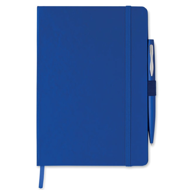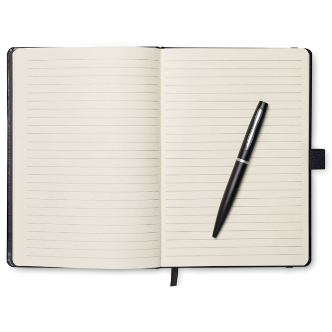 Notebook A5 con penna. Copertura rigida in PU. 144 pagine a righe (72 fogli). Cinturino di chiusura elastico e portapenne abbinati. Penna a sfera a bottone in metallo abbinata. Inchiostro blu. FSC MIX CREDIT | P7.1 | FSC-C213206