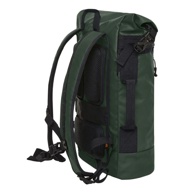 RPET 600d. rPET 600d/PU. Tutti materiali sono conformi alle ultime specifiche dell'UE. Senza PVC. Zaino roll-top elaborato, con scomparto principale con cerniera e fibbie laterali, tasca interna imbottita, ampia tasca frontale con zip, fascia funzionale sul davanti, anello di aggancio posteriore per maniglia trolley, scomparto con cerniera nascosto, sistema di trasporto imbottito con fascia pettorale regolabile in altezza, maniglia su entrambi i lati e sul retro. Dimensioni: 29 x 41 x 15 cm. Capacità: 18 lt.