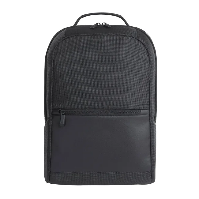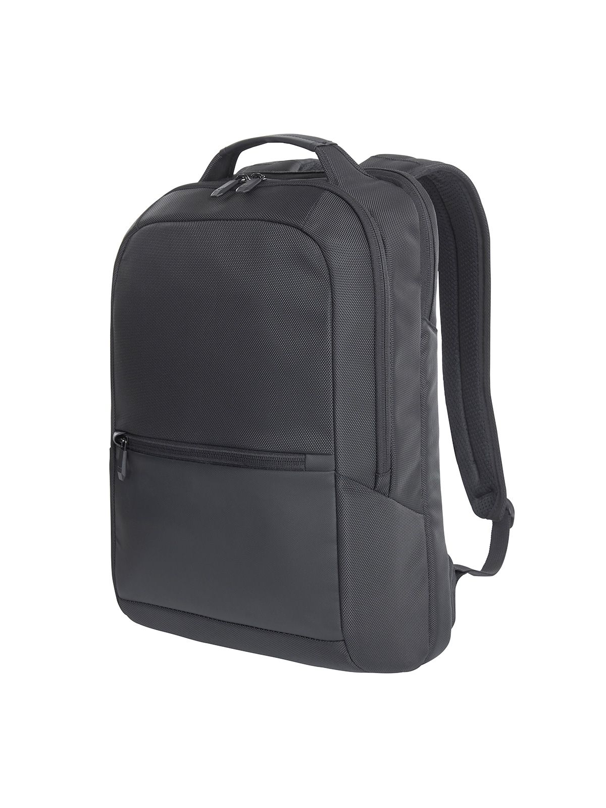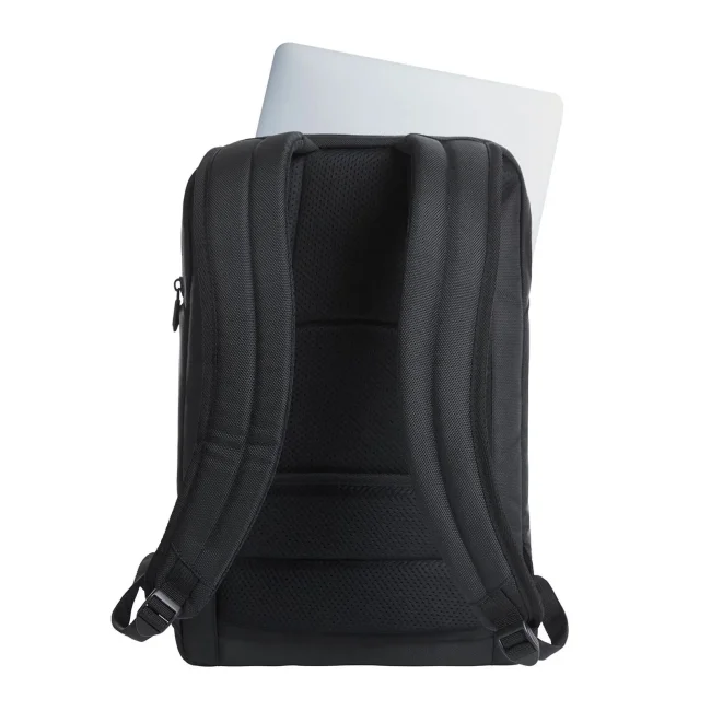 100% poliestere. Zaino lineare, tasca a inserto imbottita e scomparto a rete con chiusura lampo, ampio scomparto per notebook con accesso separato, passaggio per cavi fino allo scomparto principale, tasca anteriore con chiusura lampo, retro imbottito, passante per fissaggio all' asta del trolley, spallacci imbottiti e regolabili, manico rinforzato. Dimensioni: 30x45x15 cm. Area personalizzabile: frontale 18x11 cm.