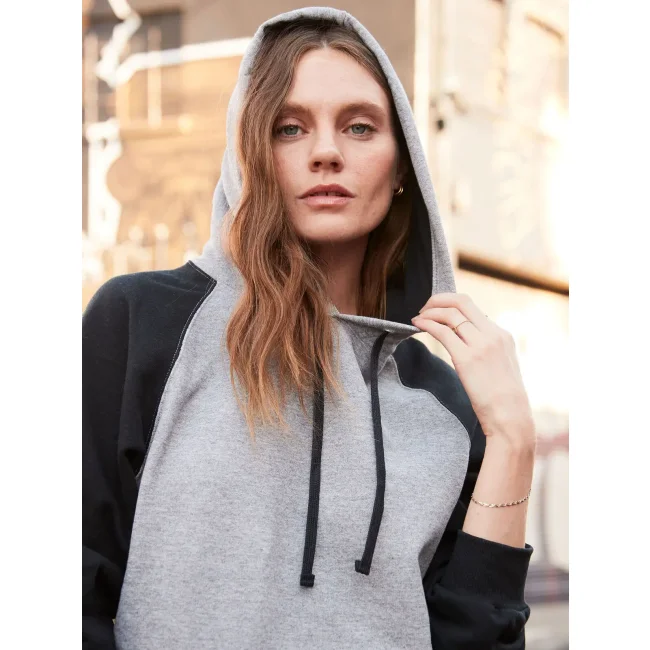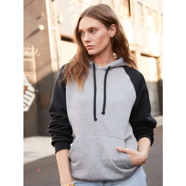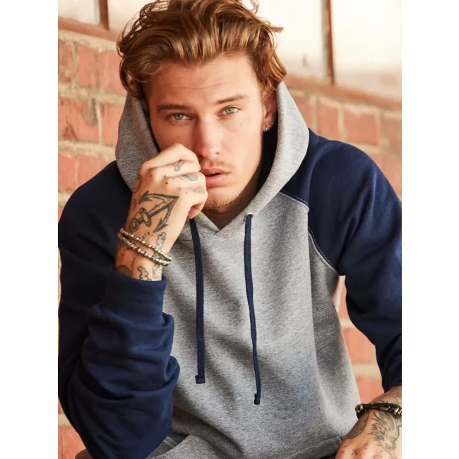 50% cotone 50% poliestere nublend. Felpa con cappuccio, in tessuto NuBlend resistente ai pelucchi, realizzata con cotone coltivato negli Stati Uniti da fonti sostenibili, alta densità di punti per una tela di stampa liscia, maniche raglan a contrasto, cappuccio foderato a doppio strato in colore a contrasto, con occhielli, impuntura ad un ago sul davanti del collo, bordo del collo in fettuccia, cordino e maniche in tessuto piatto, tasca frontale a marsupio, cucitura a due aghi su giromanica e girovita, polsini e girovita a costine. Etichetta removibile.
