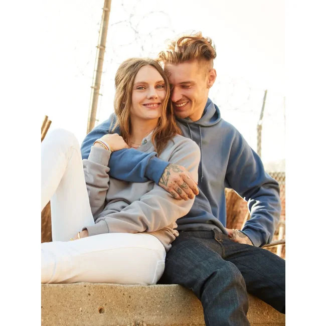 50% cotone 50% poliestere nublend. Felpa girocollo con maniche set-in in tessuto NuBlend resistente ai pelucchi, realizzata con cotone di origine sostenibile coltivato negli Stati Uniti, alta densità di punti per una tela di stampa liscia, polsini e cintura a costine con spandex per maggior elasticità, cuciture a due aghi su collo, giromanica e cintura. Etichetta removibile.