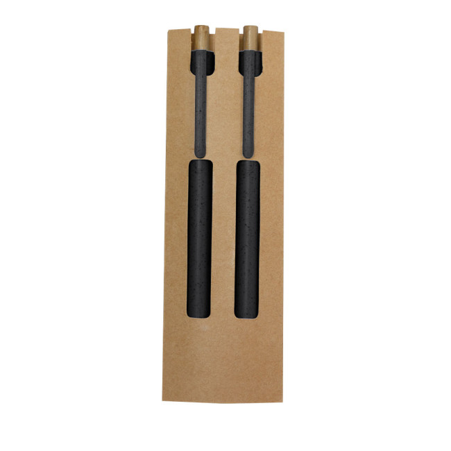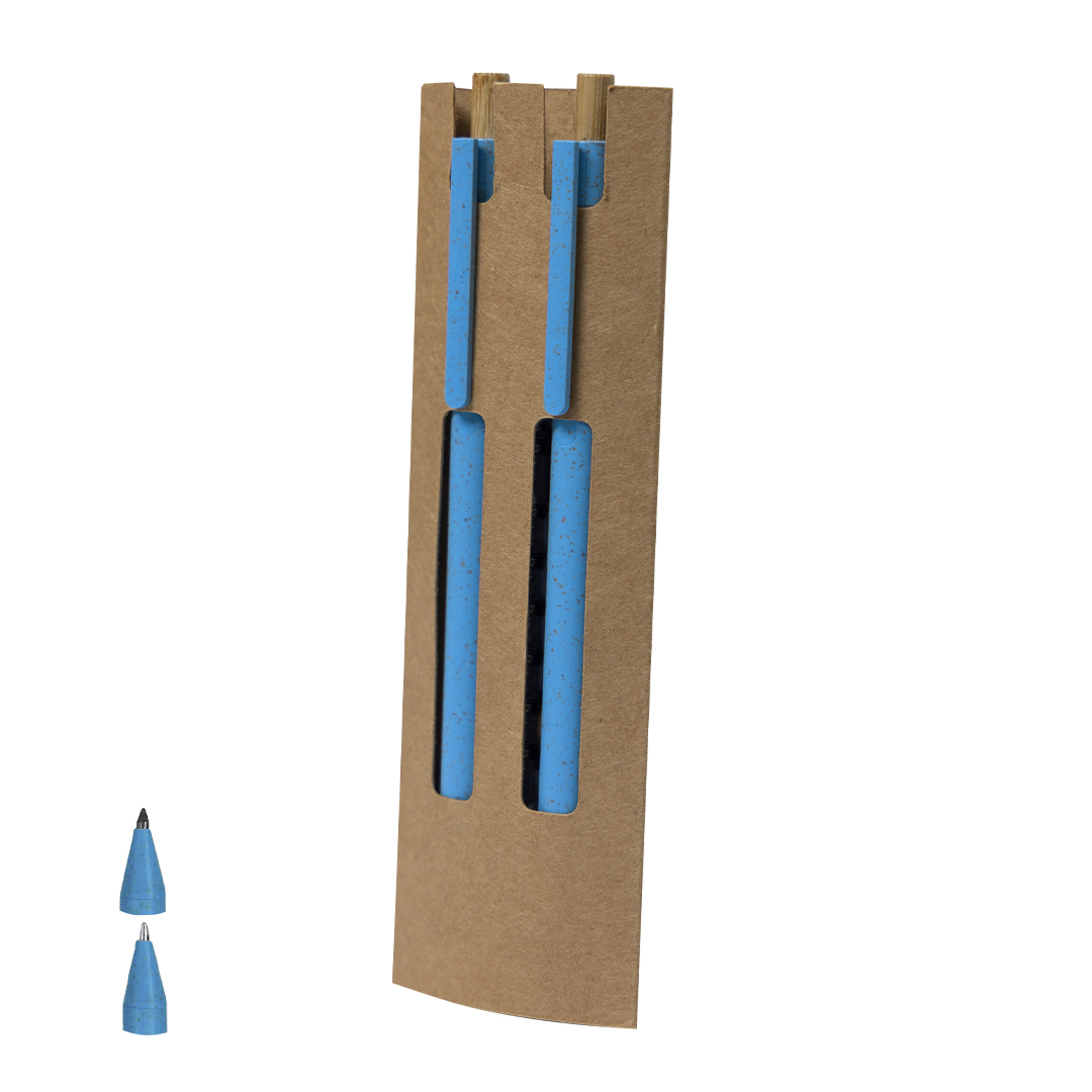 Set di penna a sfera e matita eterna realizzati in canna di grano e bambù. Penna a sfera con meccanismo a pulsante realizzata in bambù con inchiostro blu e clip coordinata. E matita con meccanismo a pulsante realizzata in bambù con punta eterna, per poter usare sempre la stessa matita e non generare rifiuti. Presentati in una scatola di cartone riciclato. Con distintivo di canna di grano stampato.Realizzato con elementi vegetali per promuovere l'utilizzo di materie prime naturali e ridurre le emissioni inquinanti.