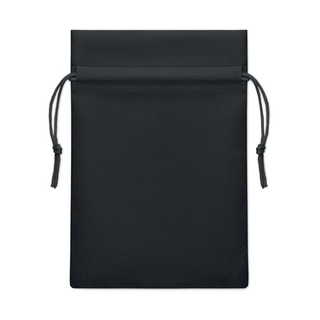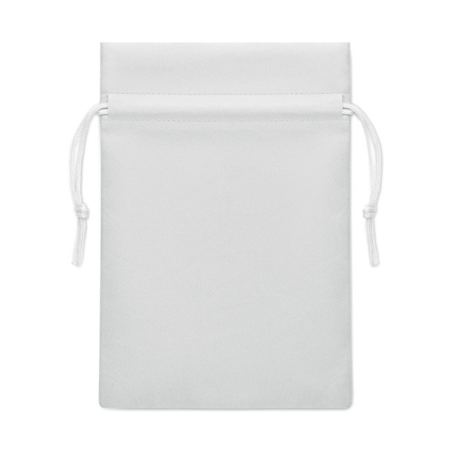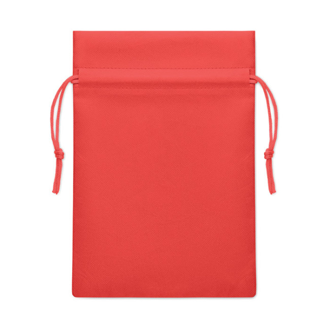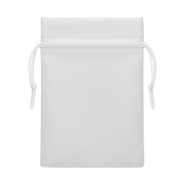 Piccola sacca regalo con cordoncino in tessuto non tessuto RPET 80 gr/m². Dimensioni circa 20x30 cm.