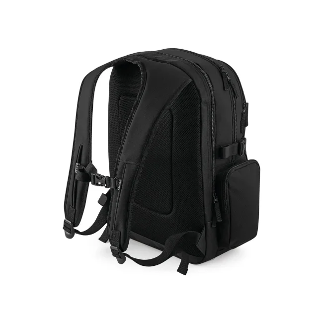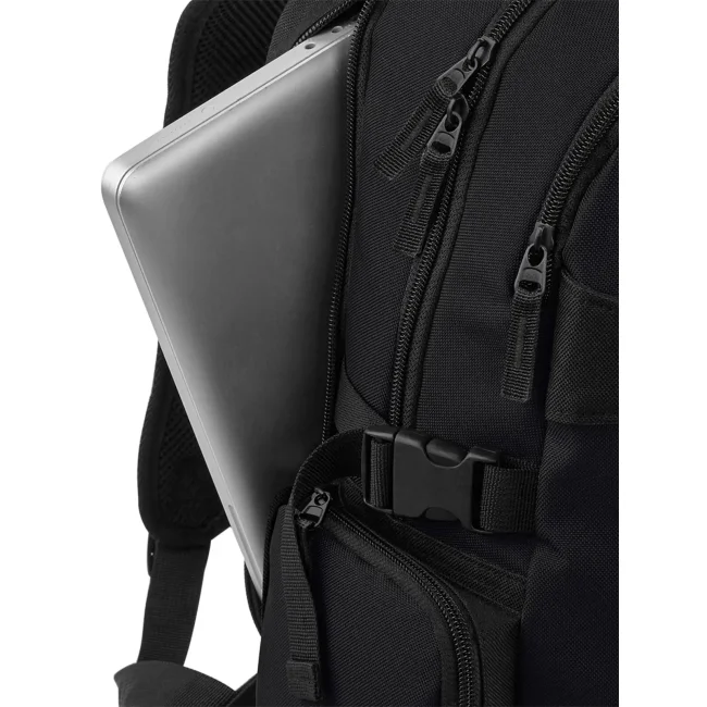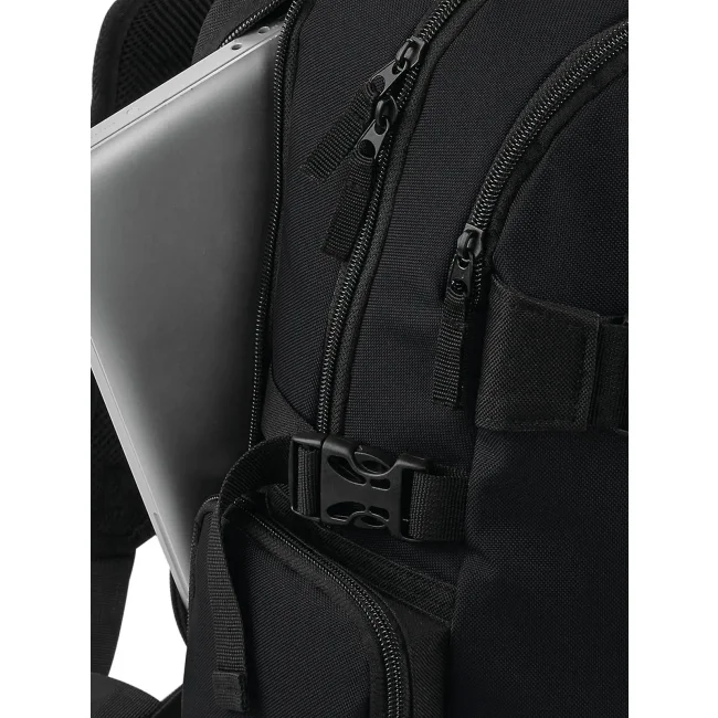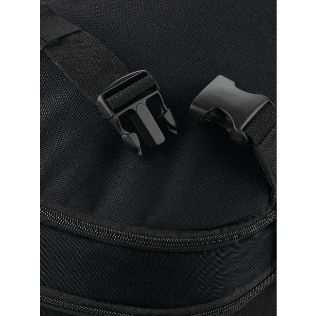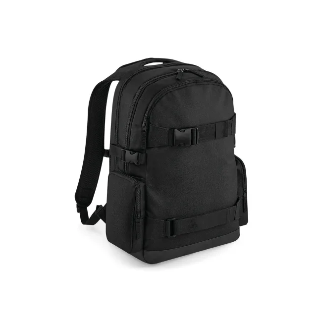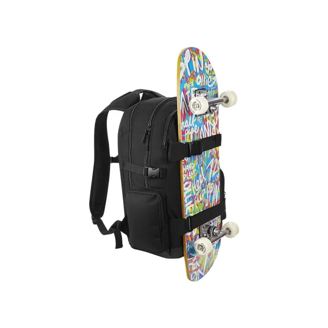 Old School Boardpack realizzato in poliestere 600D, progettato per laptop fino a 17". Include un compartimento principale, tasche laterali e una tasca frontale con cerniera. Dimensioni: 36 x 46 x 16 cm, con capacità di 23 litri e area di stampa di 23 x 14 cm per personalizzazione.