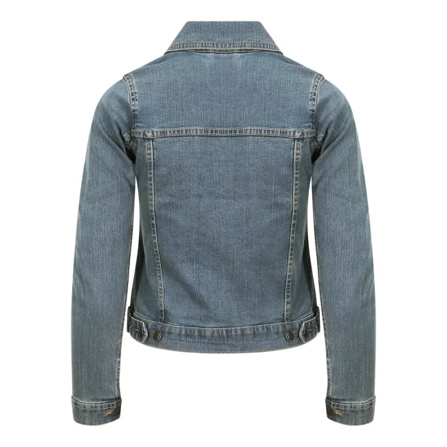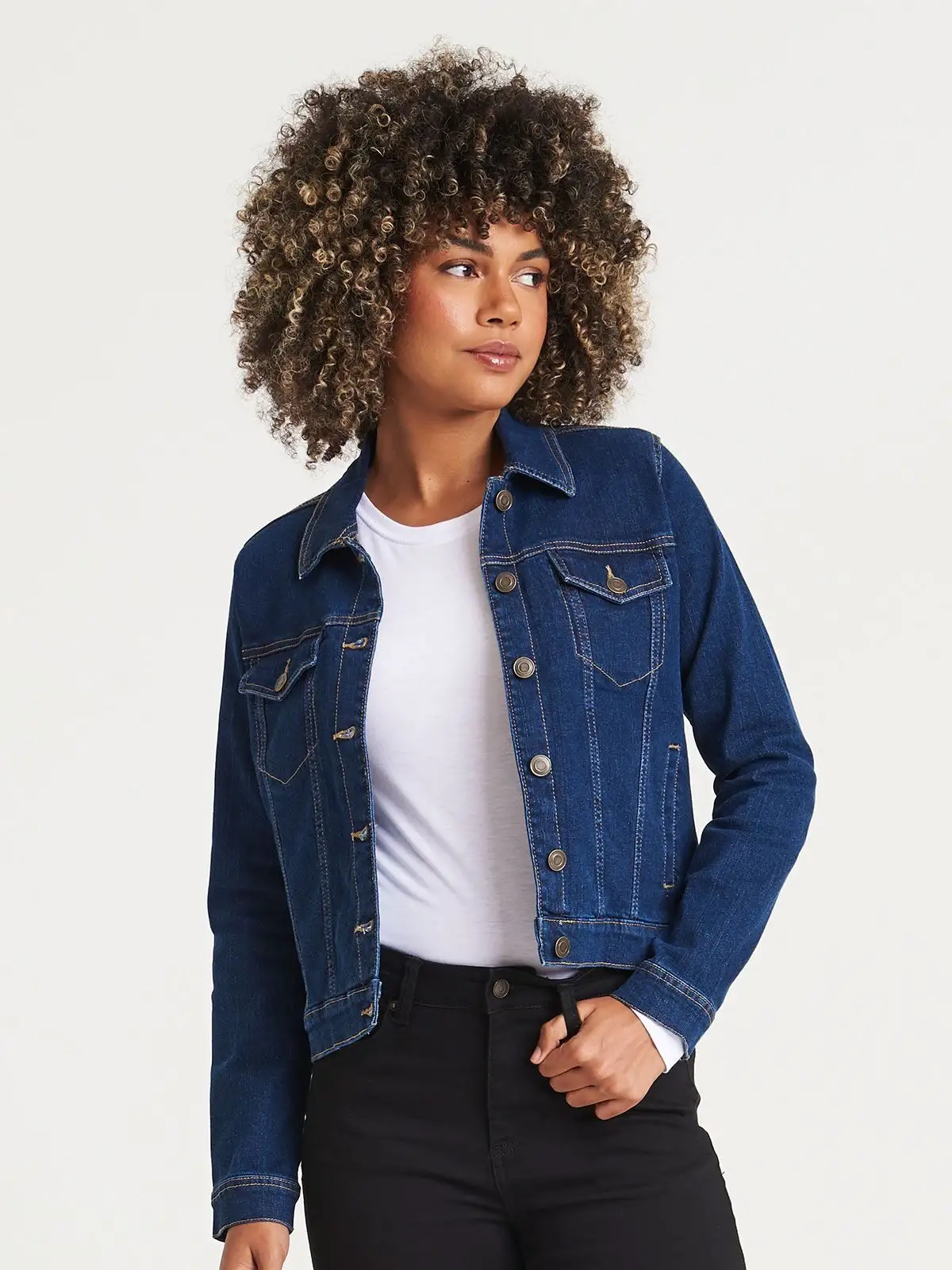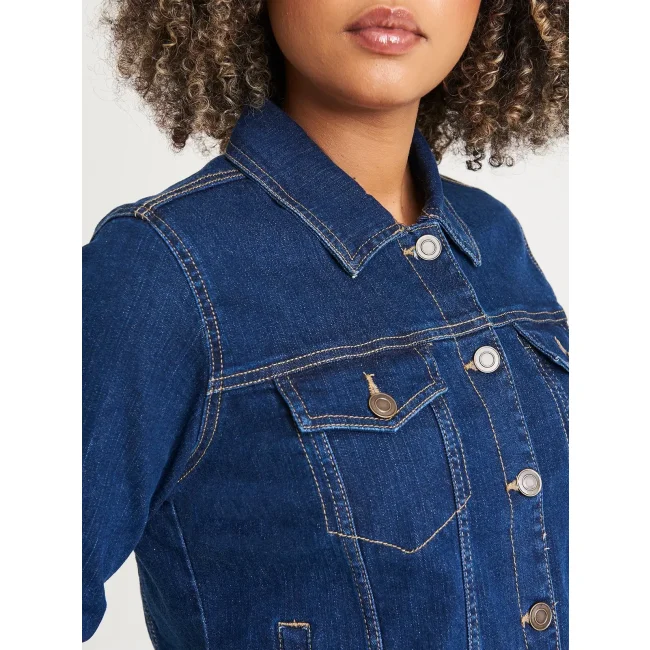 99% cotone, 1% elastan. Giacca da donna in denim elasticizzato, 4 tasche, lavaggi nei colori blu scuro e chiaro, cuciture a contrasto, chiusura con bottoni automatici, dettaglio polsino con bottoni, passante posteriore sul retro.