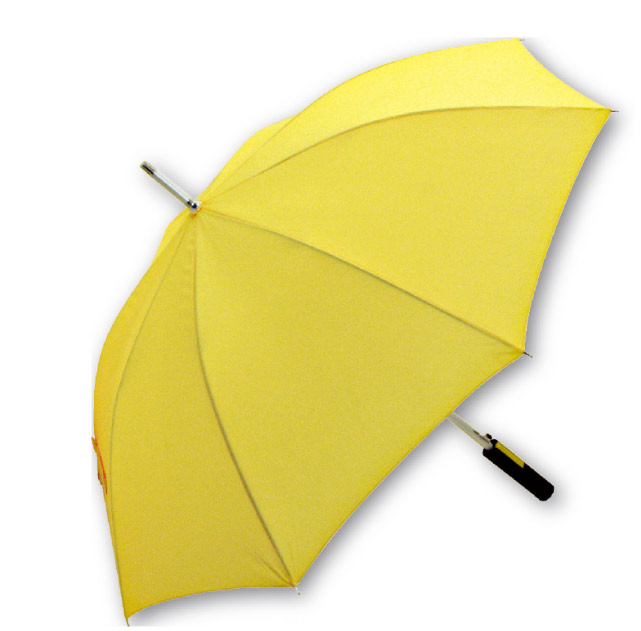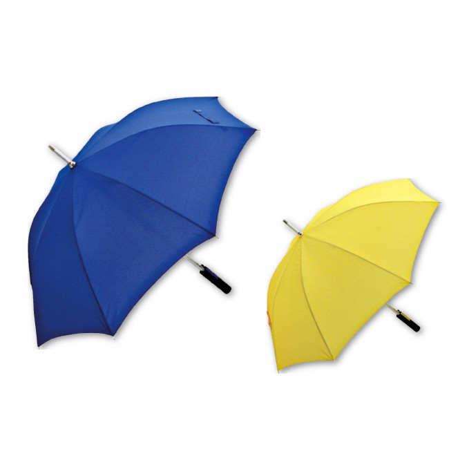 Ombrello in pongee a 8 spicchi, apertura automatica, asta in alluminio, manico nero gommato con inserto in plastica colorata. Confezione in nylon.
