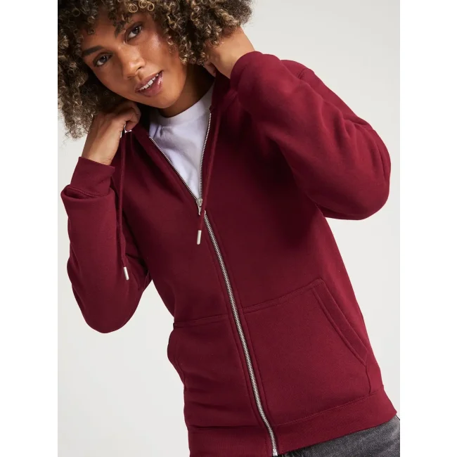 80% cotone organico, 20% poliestere riciclato. Felpa full zip con cappuccio doppio strato e cordini contrastanti, tasca a marsupio, cuciture doppie, orlo e polsini a costine, felpata internamente, etichetta stappabile. (Col. HGR: 75% cot 25% pol)