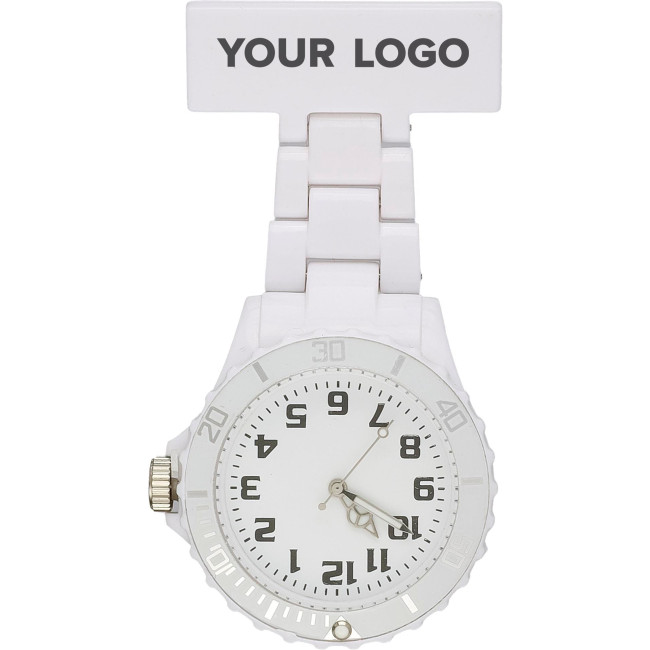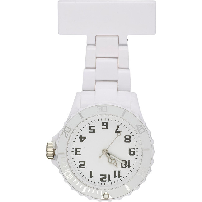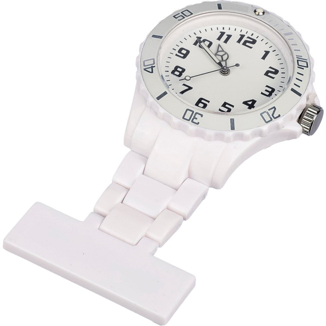 Orologio da infermiera, numerazione colorata in argento e bianco sul quadrante e sull'anello esterno, placca rettangolare con spilla di sicurezza, in ABS