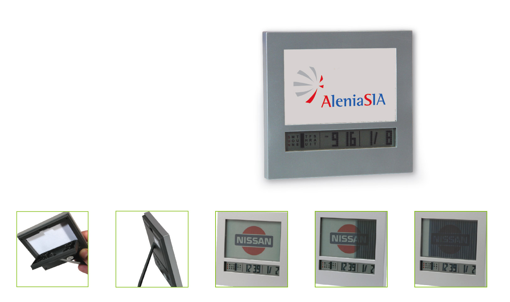 Orologio multifunzionale LCD in silver con display intercambiabile con vostro logo/foto, batterie incluse. Confezione in scatola.