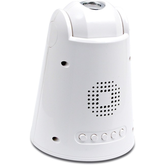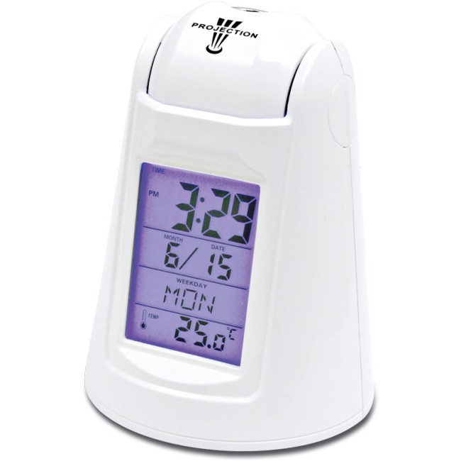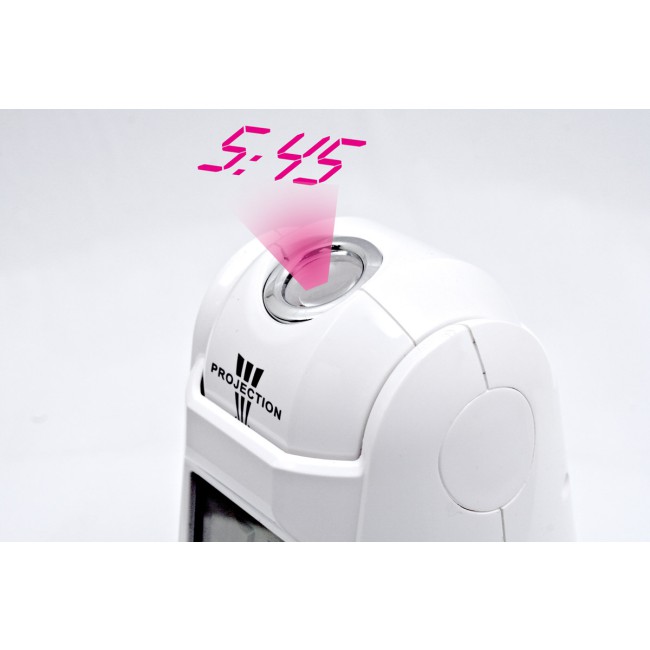 Orologio sveglia parlante con termometro e proiezione dell'ora. Colore bianco, confezione in scatoletta di caroncino bianca. Senza batterie.