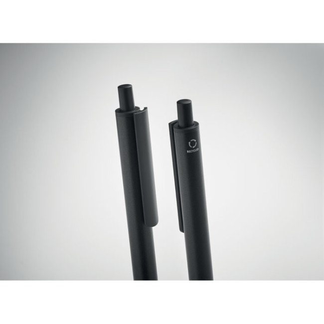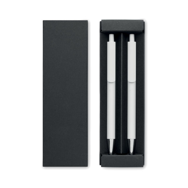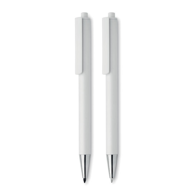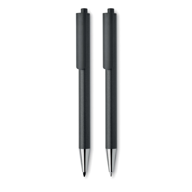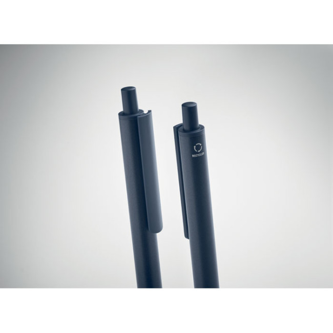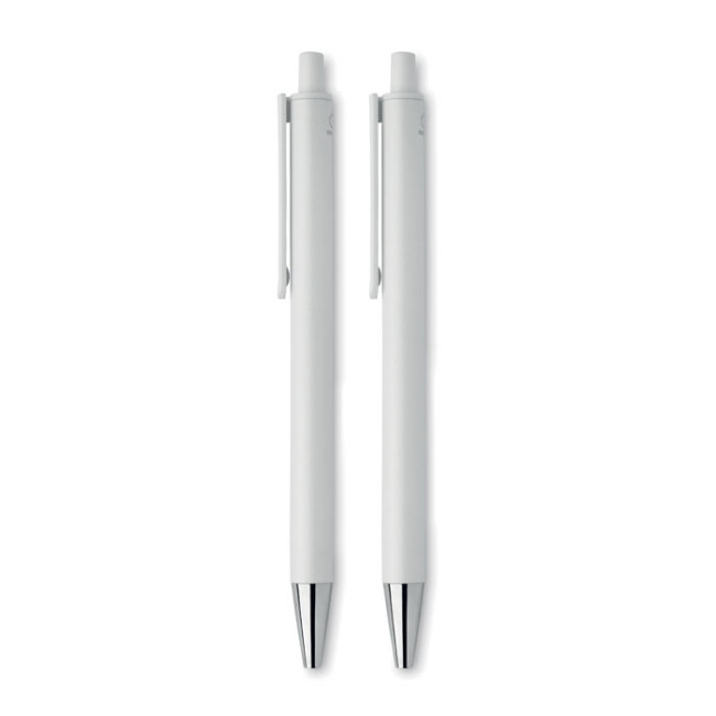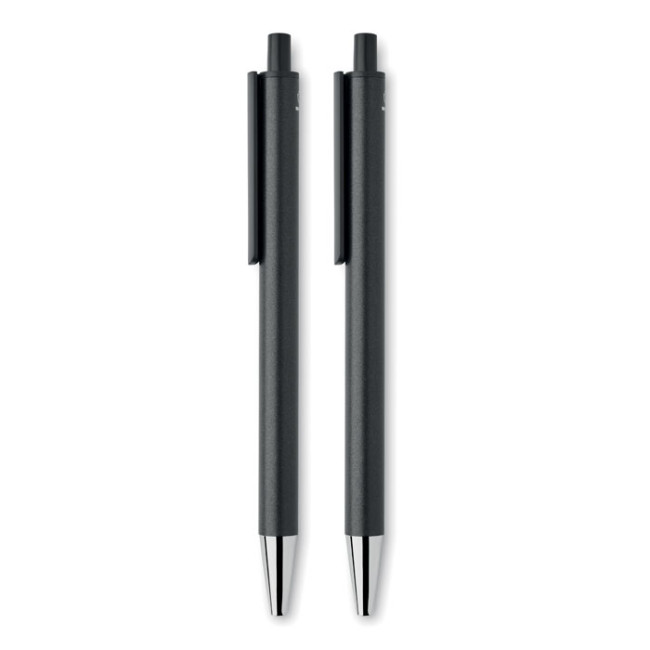 Set di penne in alluminio riciclato con 1 penna a sfera e 1 penna a inchiostro di grafite. Inchiostro blu. Presentato in una scatola di carta riciclata.