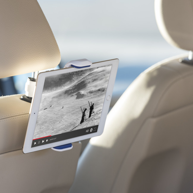 Originale supporto per dispositivi mobili fino a 10 pollici da fissare alla barra del poggiatesta dell'auto. In un'ampia gamma di colori, ruotabile a 360º e dotato di elastici antiscivolo per un'elevata presa.