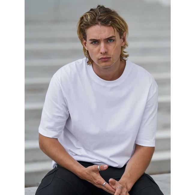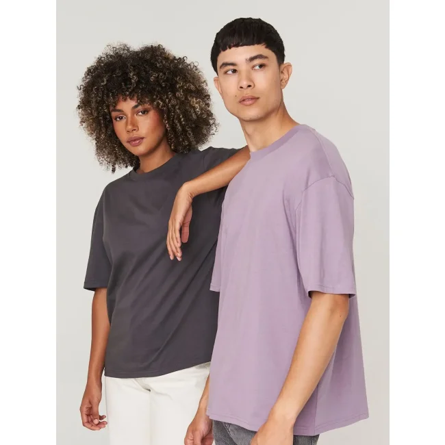100% cotone. T-shirt a girocollo oversize. Nastro di rinforzo sul collo, girocollo a costine, cuciture laterali, maniche set-in, cuciture doppie sulla manica e sull'orlo inferiore. Superficie ideale per stampa o ricamo. Etichetta taglia, ideale per il rebranding.