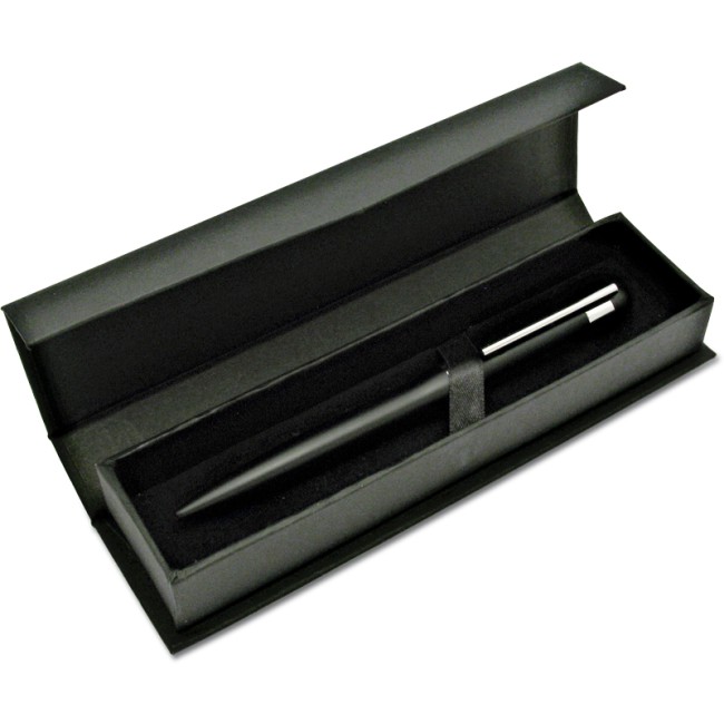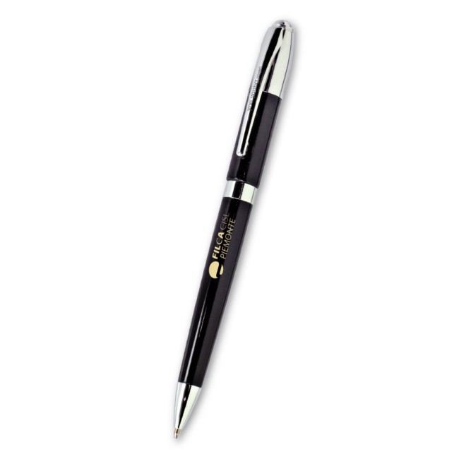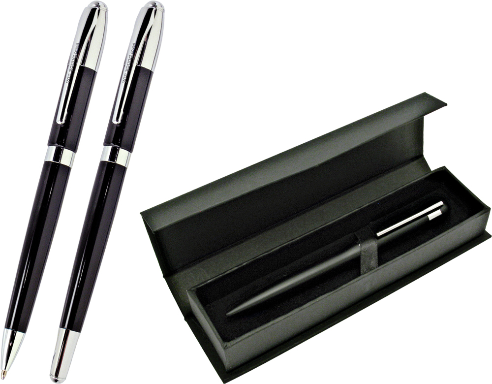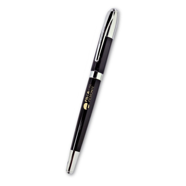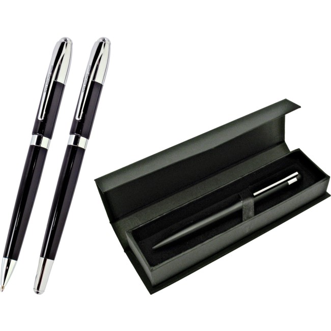 Parure penna a sfera "You Young Coveri" a rotazione e penna stilografica in metallo laccato nero con finiture cromate, refil blu. Astuccio in cartoncino nero.