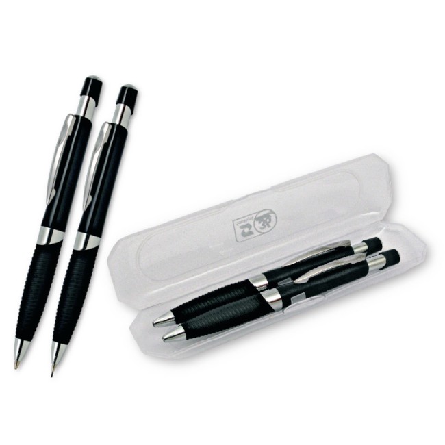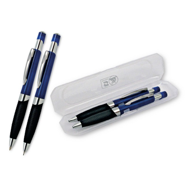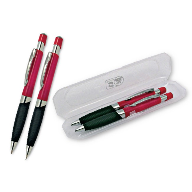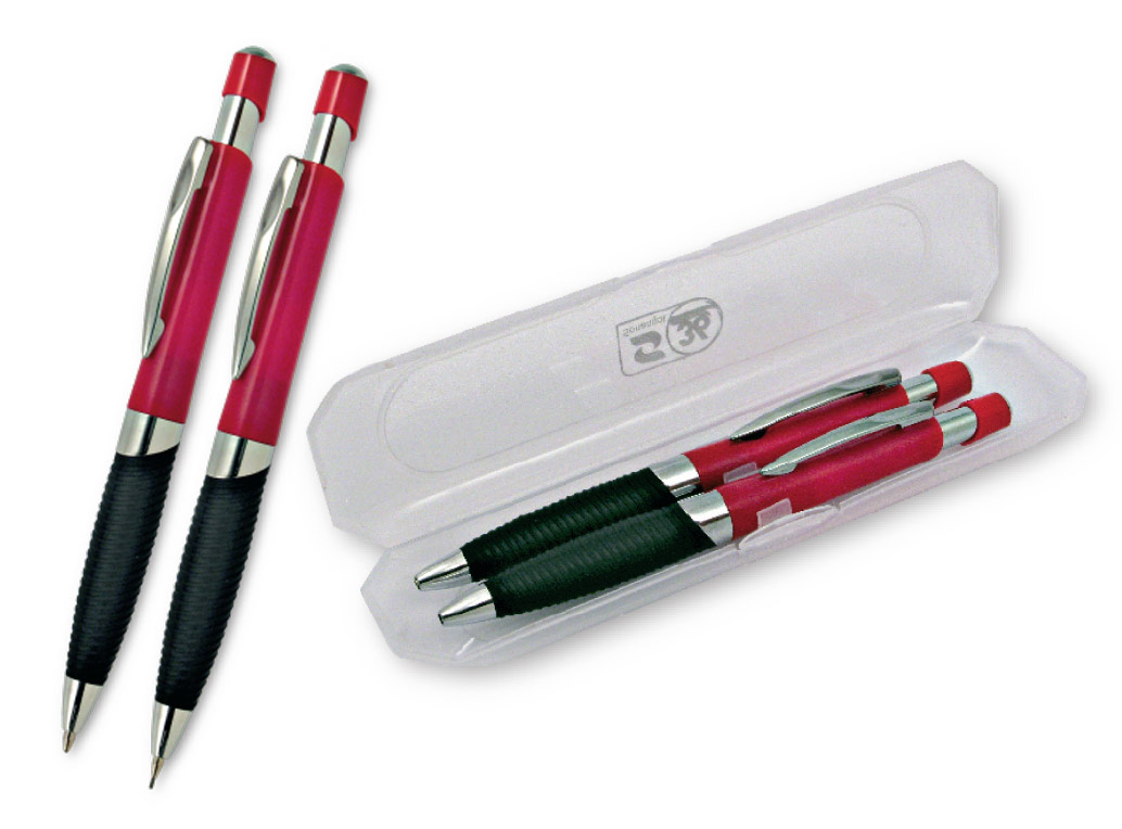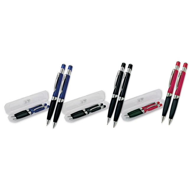 Parure composta da penna sfera a scatto e da mina, ABS colorata, impugnatura nera gommata e particolari cromati. Refil blu.