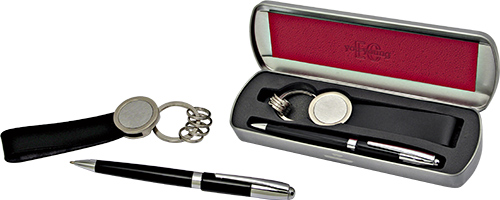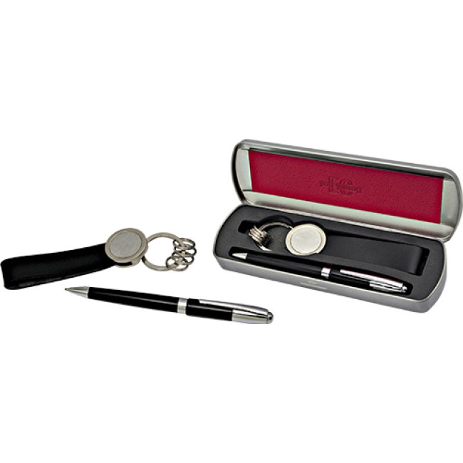 Parure you young coveri penna sfera rotazione in metallo laccato nero finit.cromate refil blu+p.chiavi similpelle nero astuccio di metallo