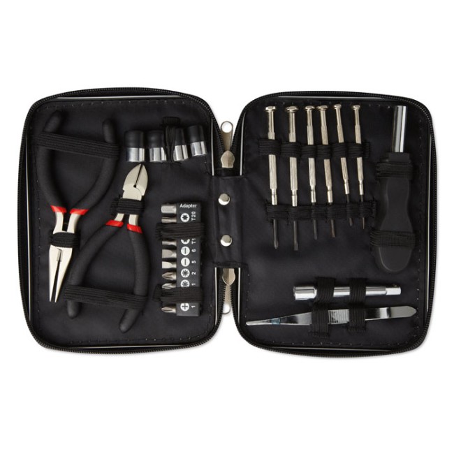 Set attrezzi in confezione di alluminio. Contiene: 1 tronchesina, 2 pinze, 6 cacciaviti di precisione, 1 cacciavite con meccanismo allungabile e 10 punte di ricambio.