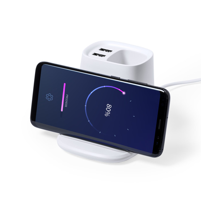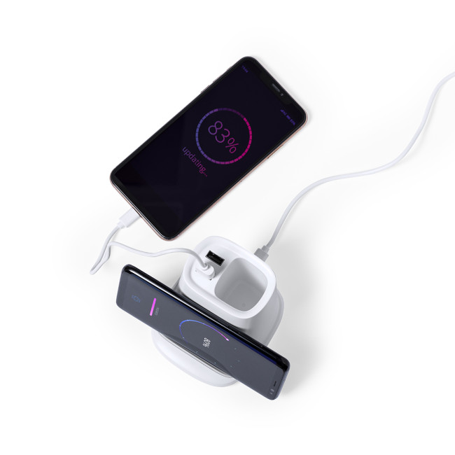 Penna multifunzione 4 in 1, realizzata in robusto materiale ABS bianco.Con funzioni di penna, supporto per smartphone, caricabatterie wireless 5W e 2 uscite USB 2000 mA. Porta USB inferiore, adatta per il trasferimento dei dati. Compatibile con gli smartphone con tecnologia di ricarica senza fili. Include un cavo di tipo C lungo 1 metro e confezionata singolarmente in scatola di design. Manuale di istruzioni disponibile in spagnolo e inglese