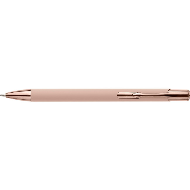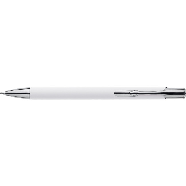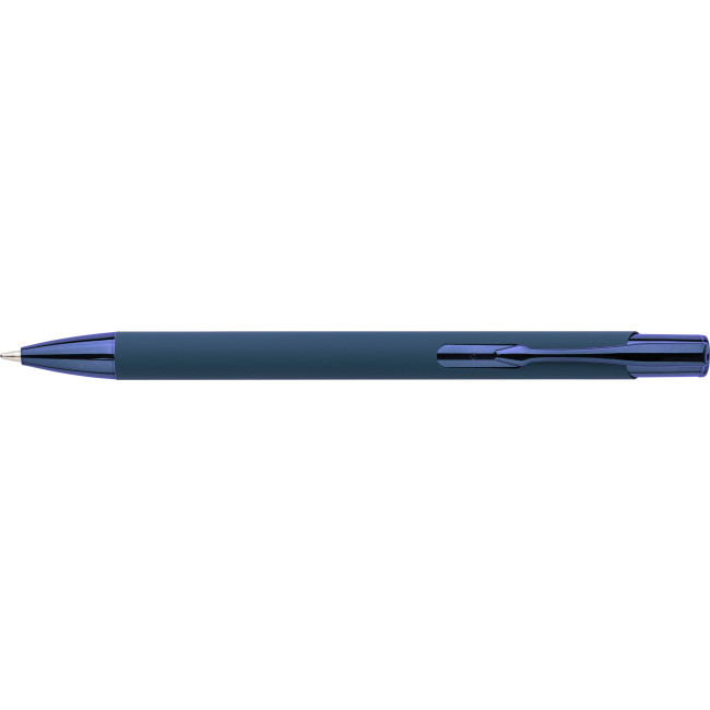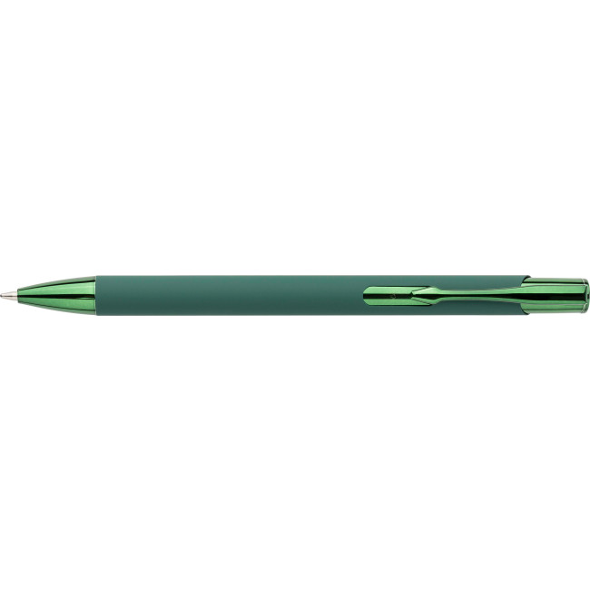 Penna a sfera in alluminio riciclato, rivestimento gommato effetto soft touch sul corpo, con pulsante a pressione in plastica lucida UV, punta in plastica cromata UV e clip in metallo con rivestimento UV, tutto nei colori coordinati; dopo l’incisione appare un effetto specchio lucido nel colore della penna, include logo "riciclato" inciso, lunghezza di scrittura circa 800?metri, refill blu.