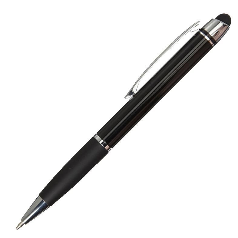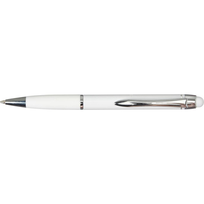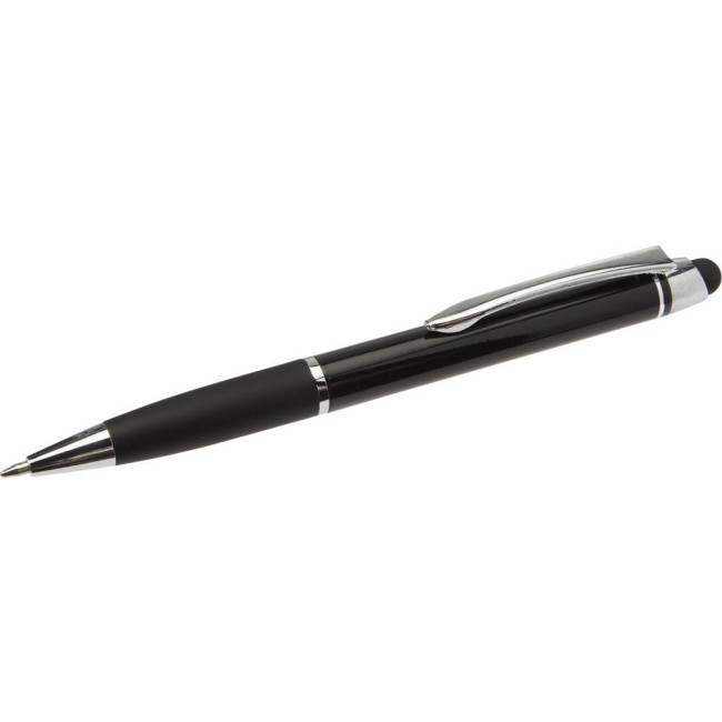 Penna a sfera in alluminio lucida capacitiva (compatibile su schermi touch), meccanismo a rotazione, impugnatura in gomma, finiture argentate, refill nero