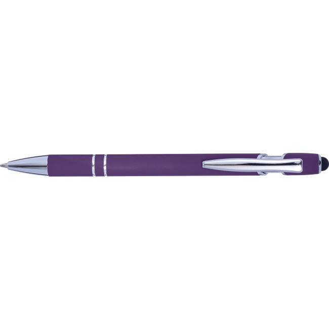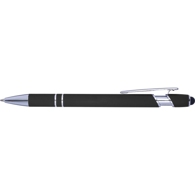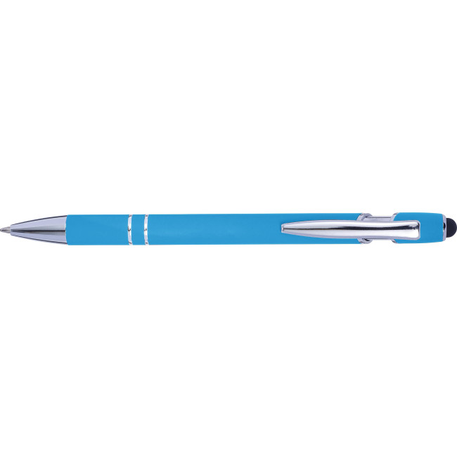 Penna a sfera in alluminio capacitiva (compatibile su schermi touch), finitura in gomma, punta e clip sono in ABS argentata, refill blu