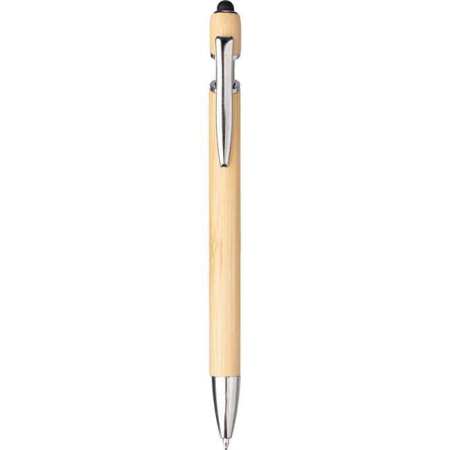 Penna a sfera in bambù capacitiva (compatibile su schermi touch), finitura cromate, clip in metallo, refill blu