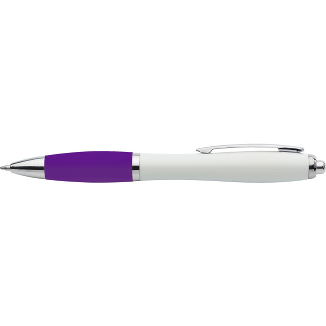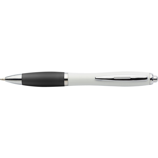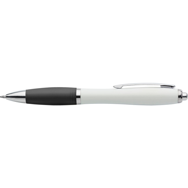 Penna a sfera in ABS riciclato, corpo bianco, impugnatura in gomma, refill blu