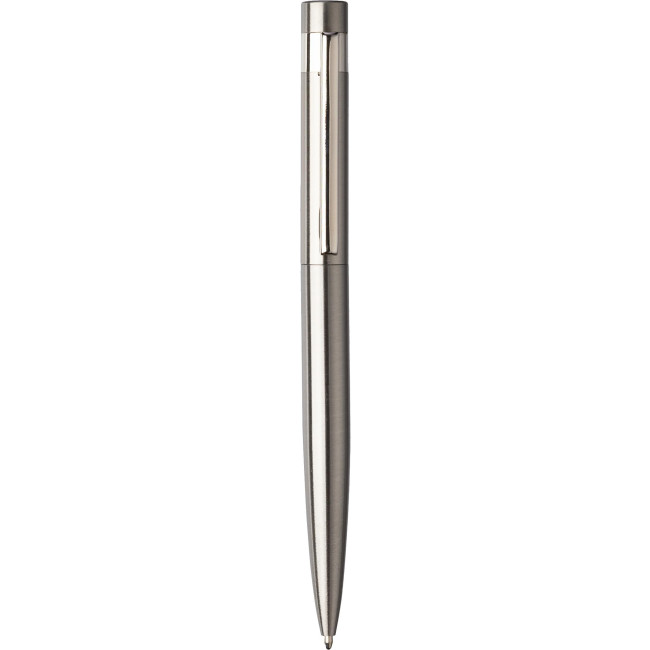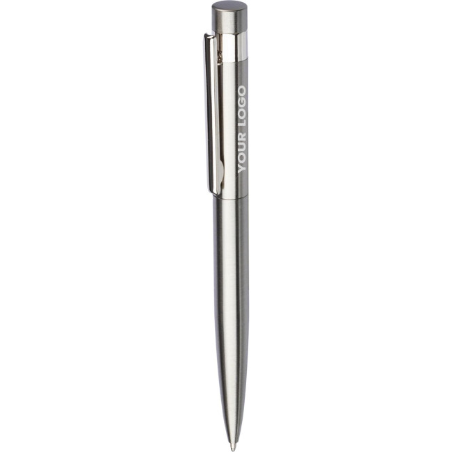 Penna a sfera in acciaio inox riciclato, meccanismo a rotazione, include logo “acciaio inox riciclato” sul retro, custodia singola in carta kraft, refill blu