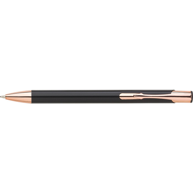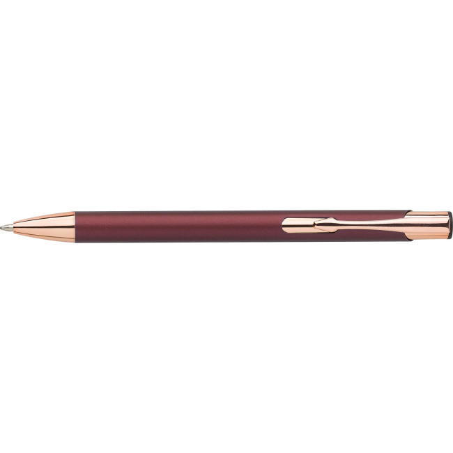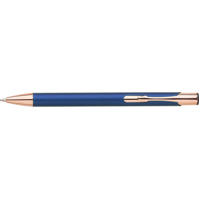 Penna a sfera in alluminio, finitura opaca, dettagli color oro rosa, refill blu, una volta inciso, il logo emergerà in colore argento