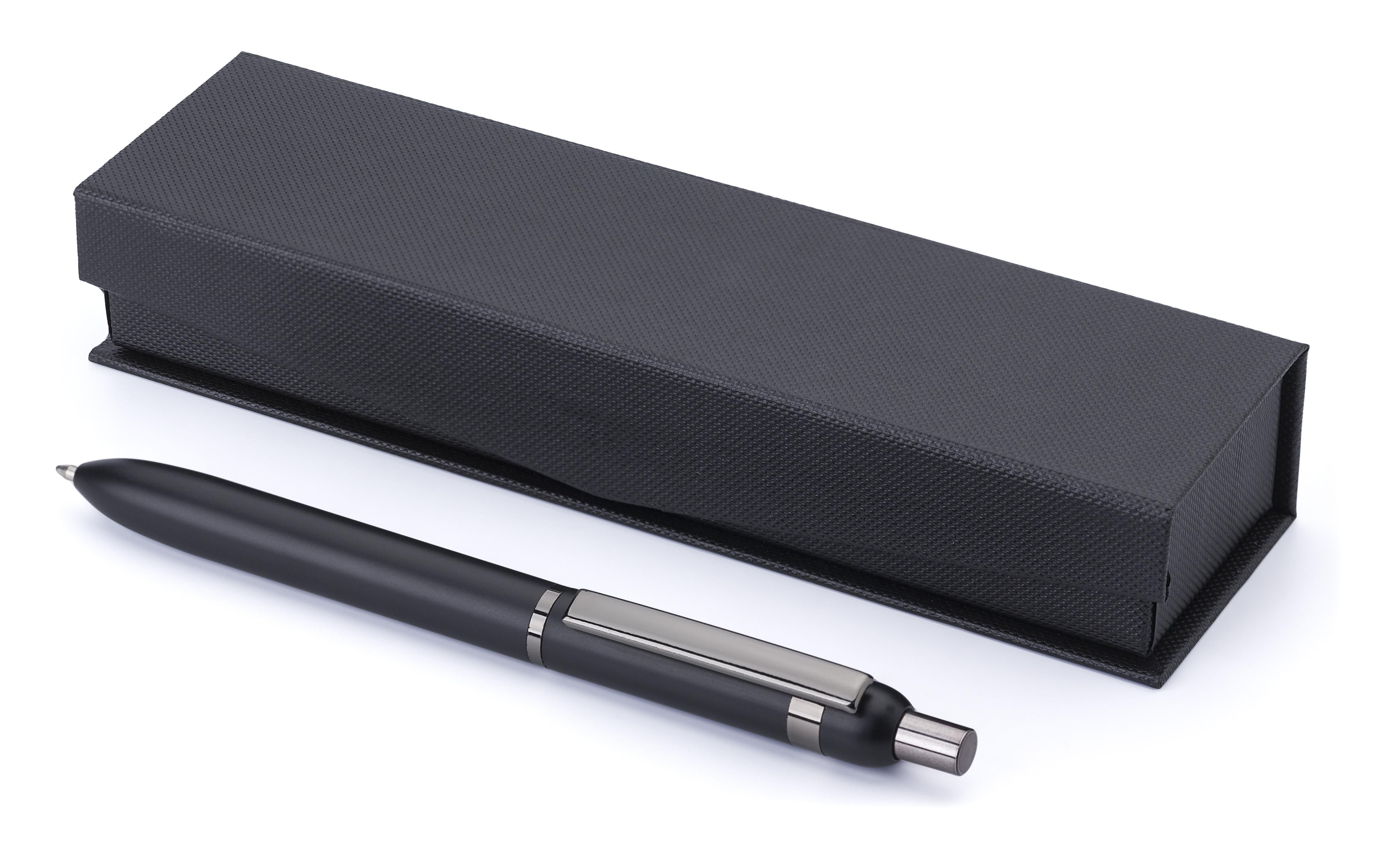 Penna a sfera in alluminio e ottone, dettagli lucidi sulla clip, anello, meccanismo a tasto, confezione regalo magnetica singola in carta, refill blu