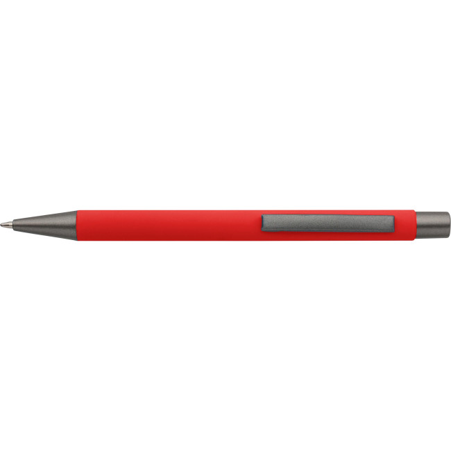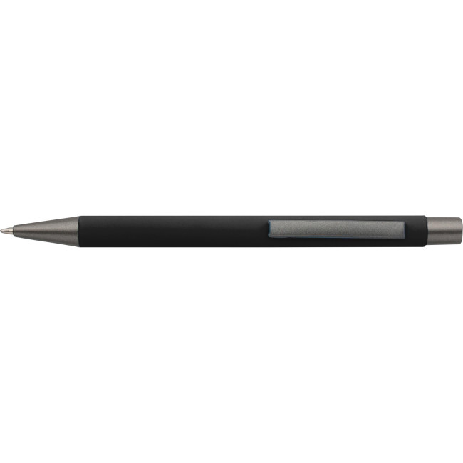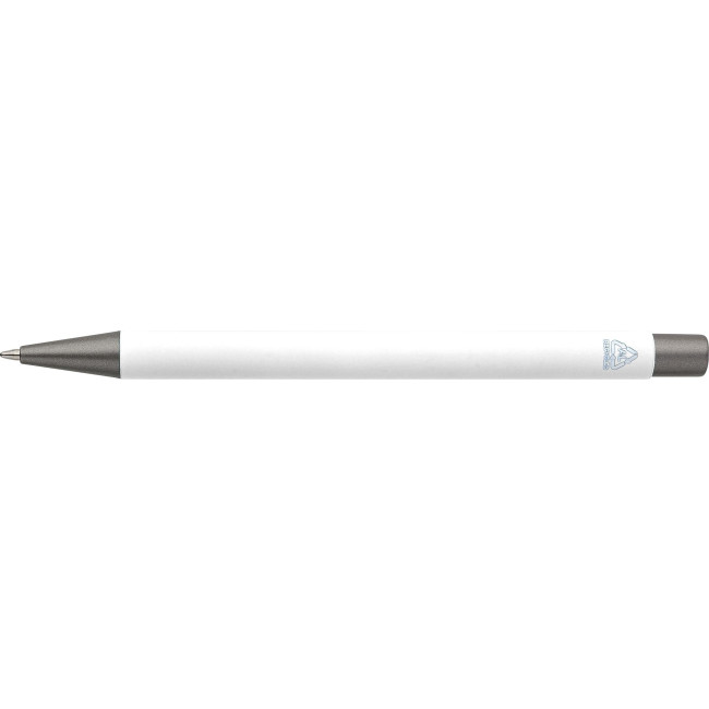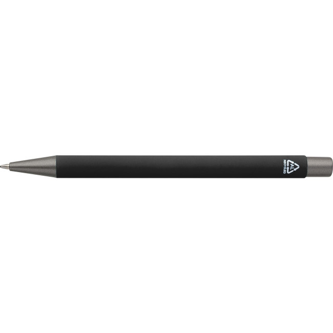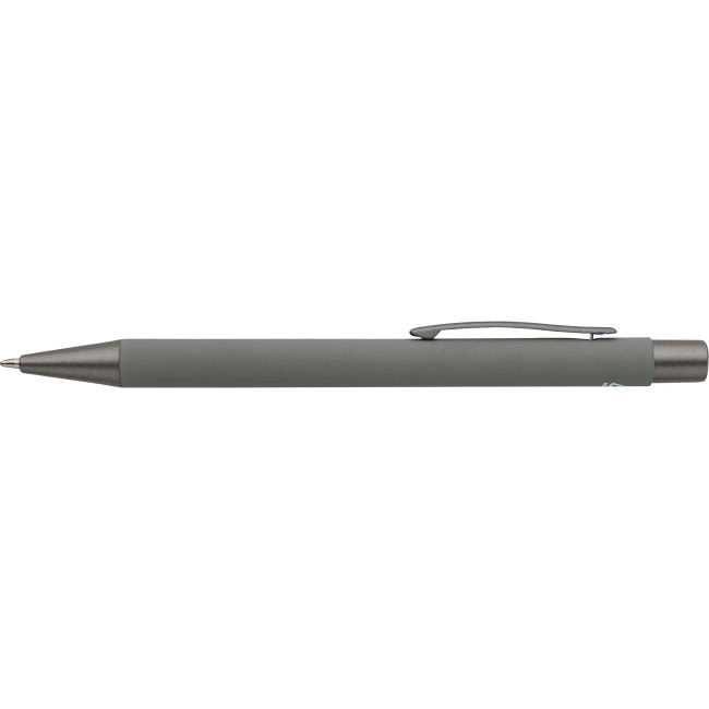 Penne a sfera in alluminio riciclato con finitura in gomma morbida al tatto e refill blu. Progettate con dettagli grigio scuro e uno strato effetto specchio sotto il rivestimento per un risultato inciso sorprendente. Dotate di meccanismo a pulsante e rifinite con logo riciclato inciso.