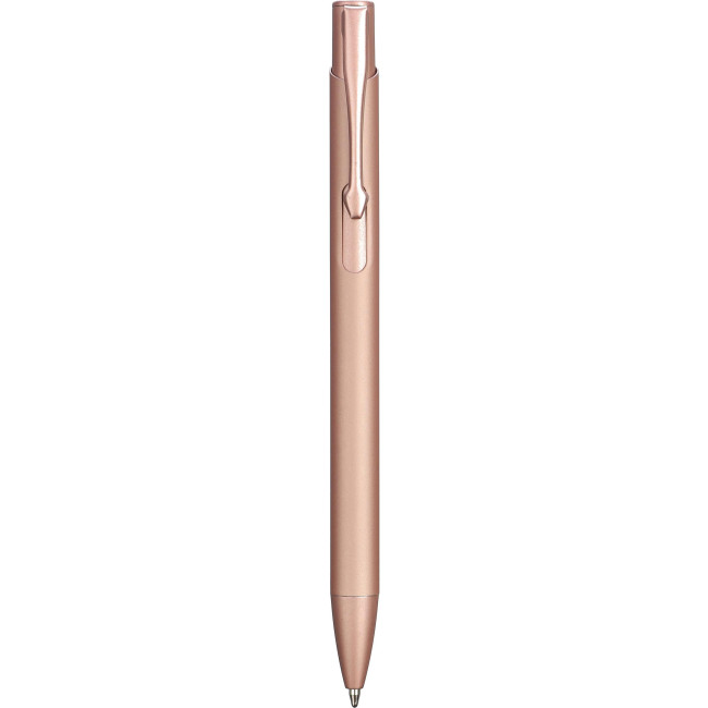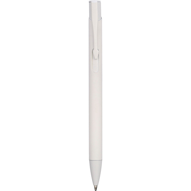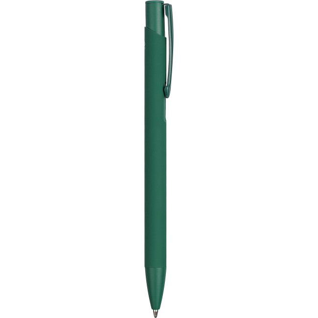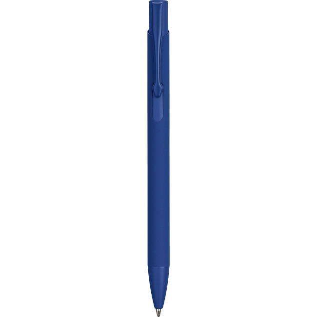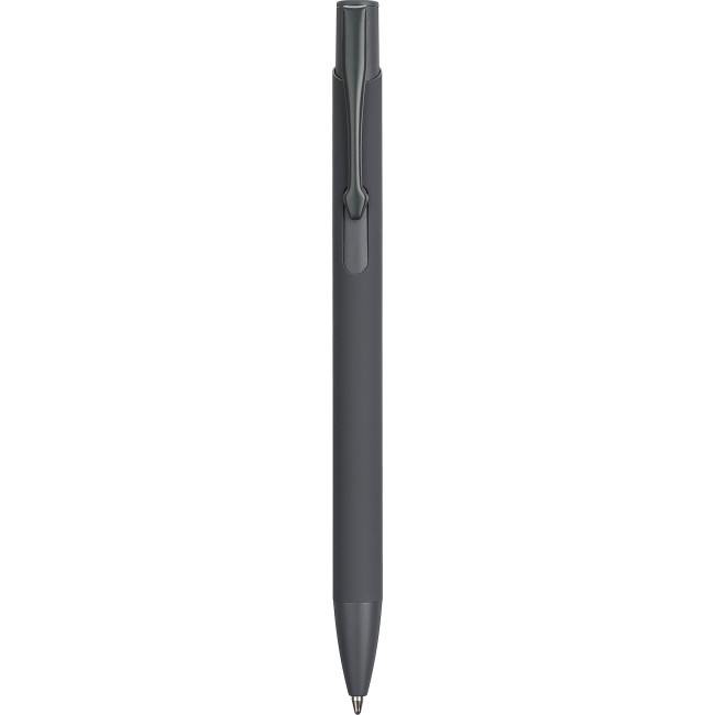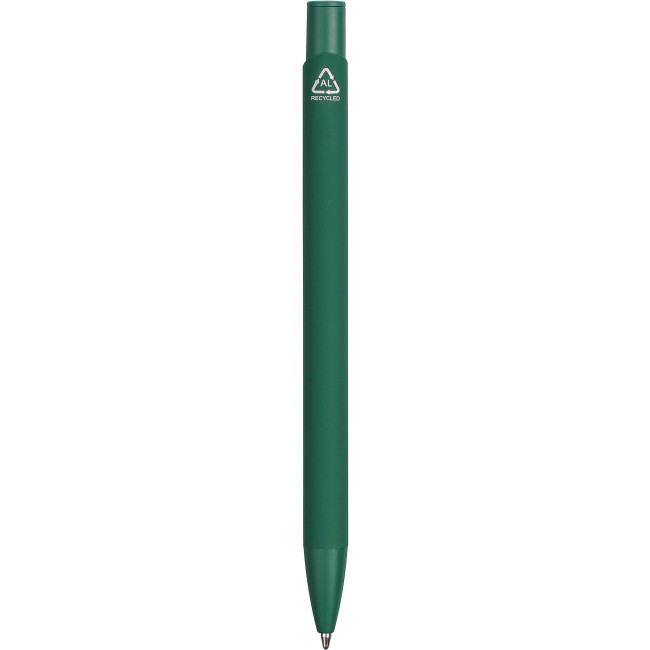 Penna a sfera in alluminio riciclato, rivestimento gommato sul corpo, clip in metallo, punta plastica e pulsante in tinta, lunghezza di scrittura di circa 800 metri, logo 'alluminio riciclato' inciso, refill blu