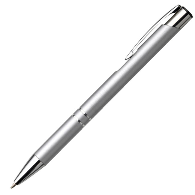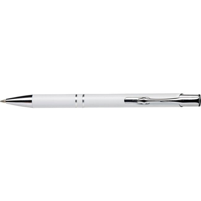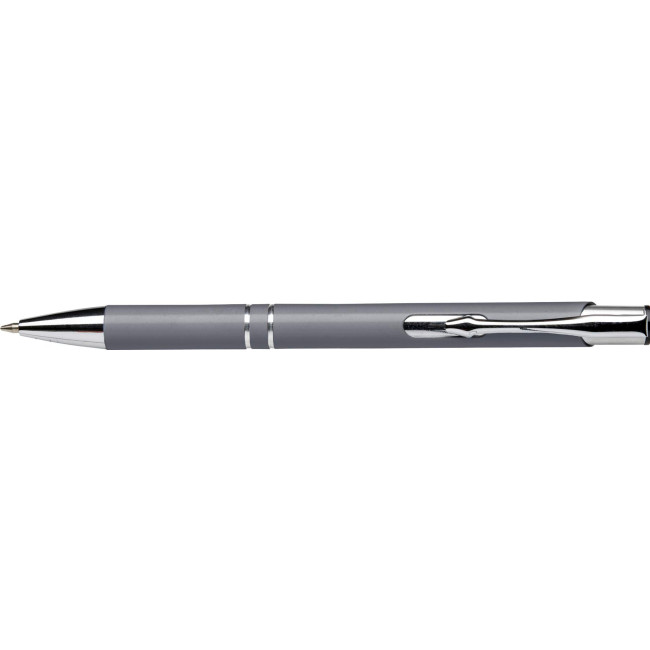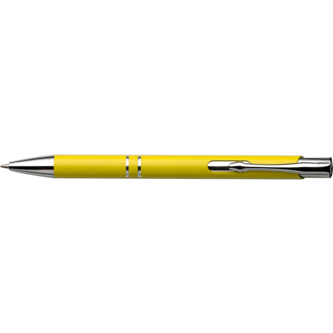 Penna a sfera in alluminio riciclato, corpo colorato, due anelli decorativi, punta e clip in metallo, refill blu