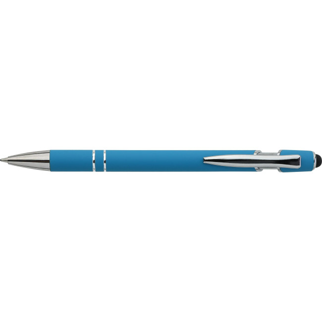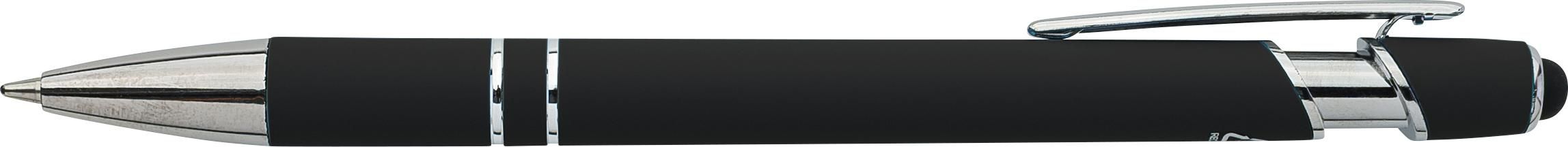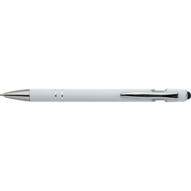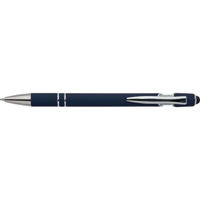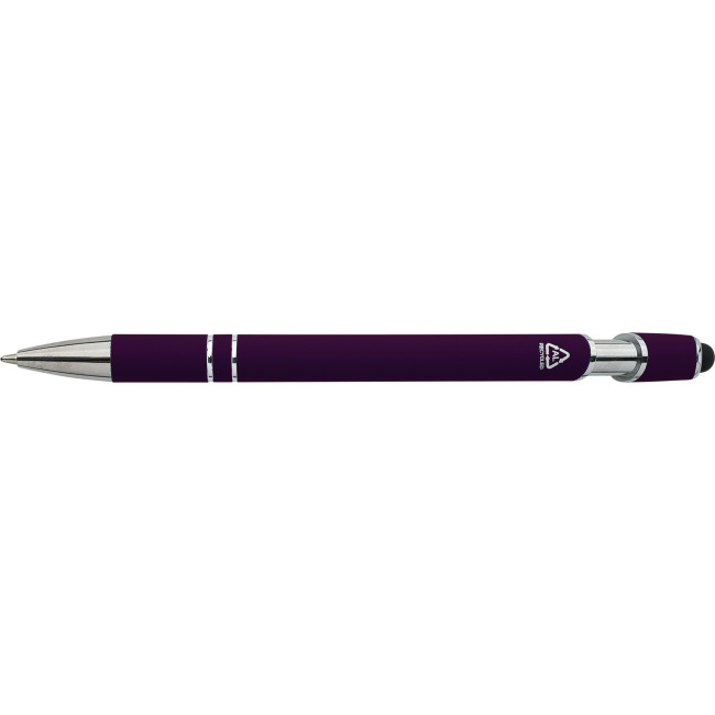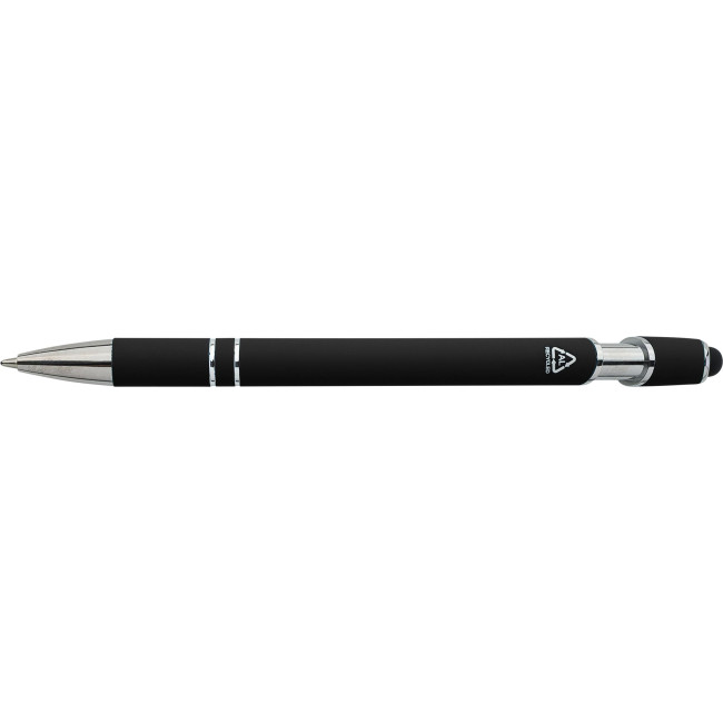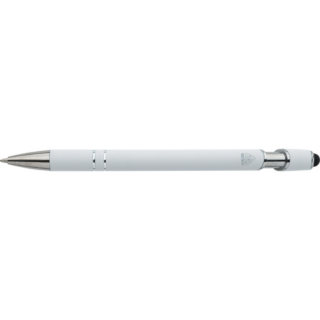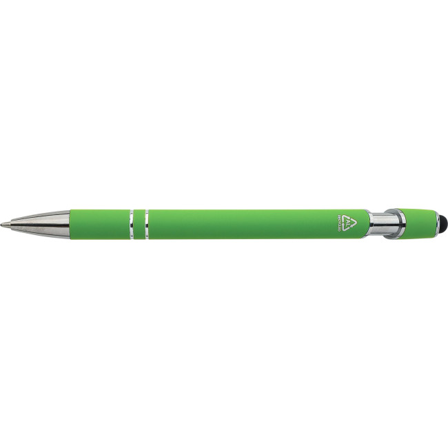 Penna a sfera in alluminio riciclato, corpo monocolore con finitura in gomma e punta stilo capacitiva nera. Progettata con dettagli argentati, meccanismo a pressione e refill blu. Rifinita con logo riciclato inciso sul fusto.