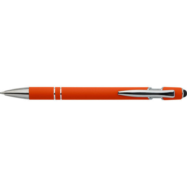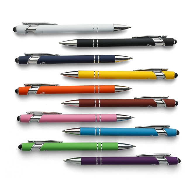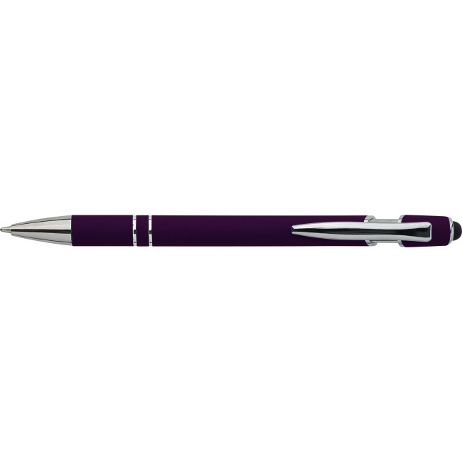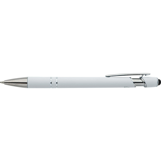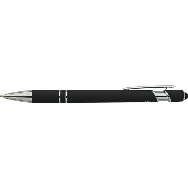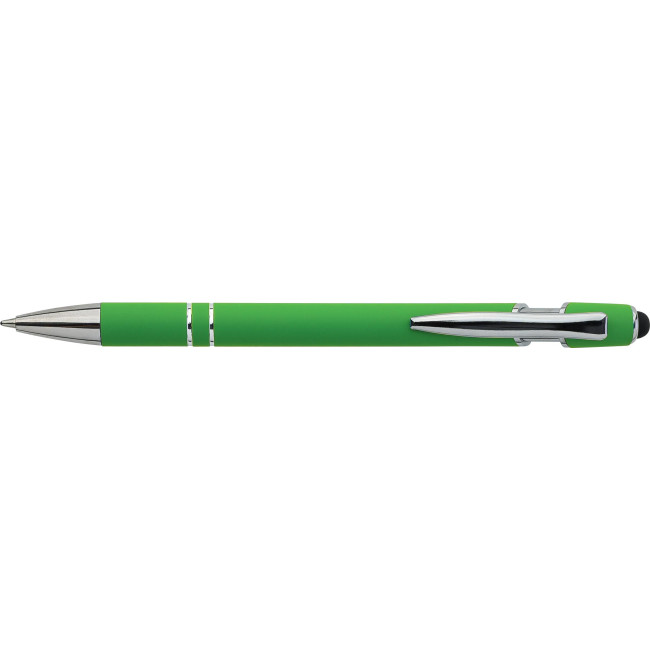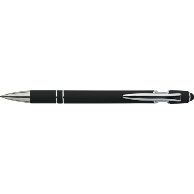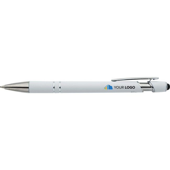 Penna a sfera in alluminio riciclato, corpo monocolore con finitura in gomma e punta stilo capacitiva nera. Progettata con dettagli argentati, meccanismo a pressione e refill blu. Rifinita con logo riciclato inciso sul fusto.