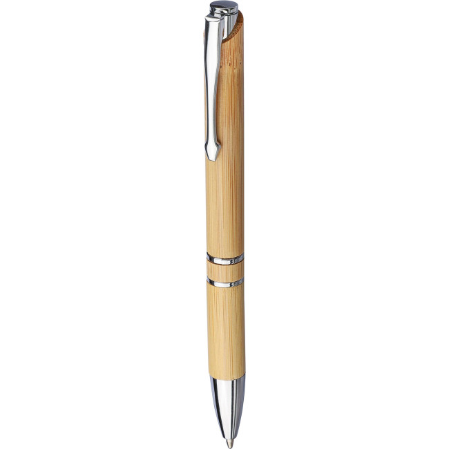 Penna a sfera in bambù, dettagli cromati, due anelli, pulsante e punta in plastica, clip in metallo, refill nero