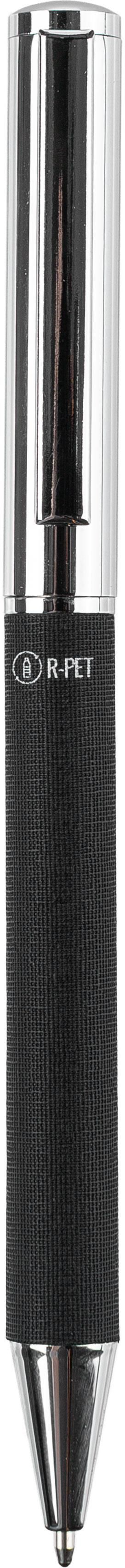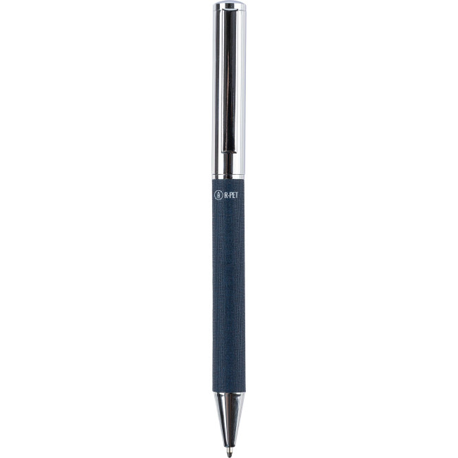 Penna a sfera rPET in ottone, clip e impugnatura in metallo, meccanismo a rotazione, il logo rPET sul corpo, refill blu, confezionata singolarmente in una scatola di cartone avana.