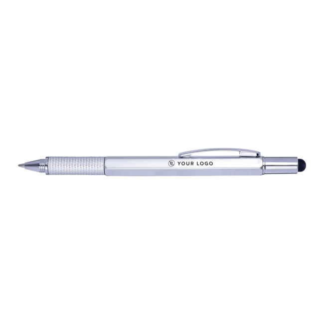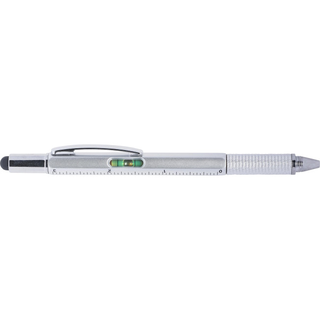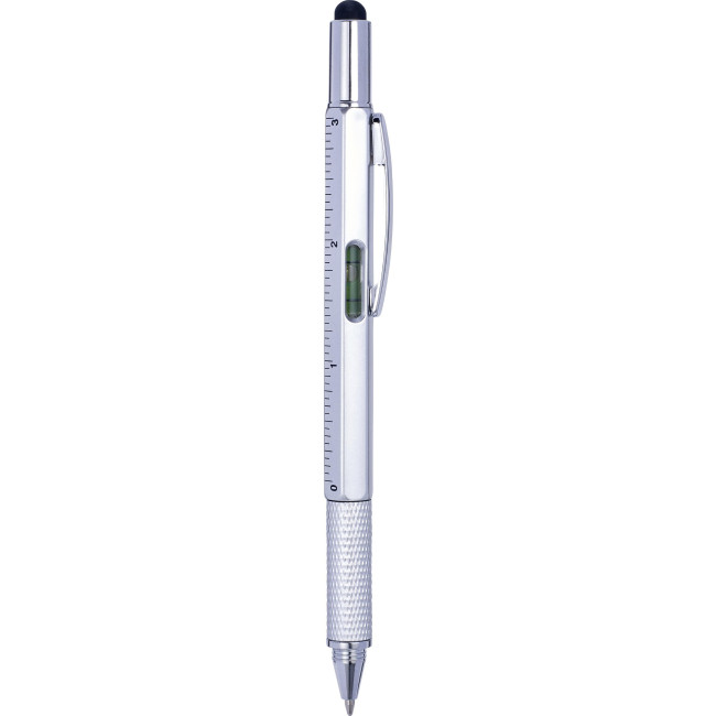 Penna a sfera multifunzione in ABS con meccanismo a rotazione, include una livella, un righello e una punta in gomma per schermi capacitivi, svitando la punta in gomma si ottiene un cacciavite nascosto, refill nero