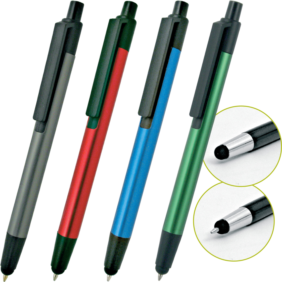 Penna a sfera a scatto dotata di puntale con gommino capacitivo, ideale per l'uso su touchscreen. Con refil blu e un design pratico, è perfetta per chi cerca un accessorio versatile. Personalizzabile con logo, è un'ottima scelta per eventi e regali aziendali.