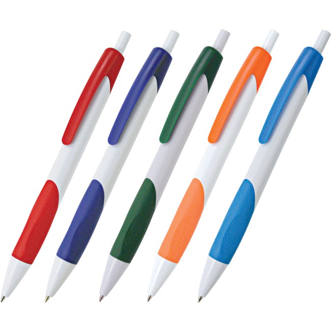 Penna sfera plastica, impugnatura gommata. Meccanismo a scatto. Refil ink blue 1.0 mm.
