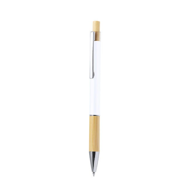Penna elegante in bambù e alluminio con meccanismo a pulsante. Dotata di fusto in alluminio con finitura lucida e impugnatura in bambù, questa penna è presentata in un astuccio individuale riciclato, riducendo l'impatto ambientale.