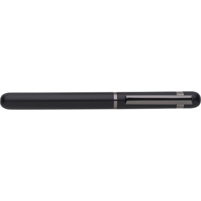 Penna rollerball in alluminio e ottone, dettagli lucidi sulla clip, anello, meccanismo a tasto, confezione regalo magnetica singola in carta, refill blu