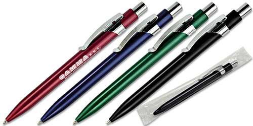 Penna sfera a scatto, fusto in plastica colorata metallizzata, particolari in metallo. Refil nero. Confezione in polybag.