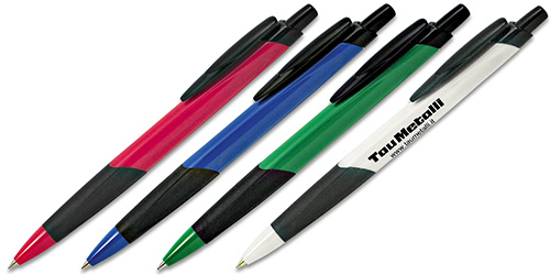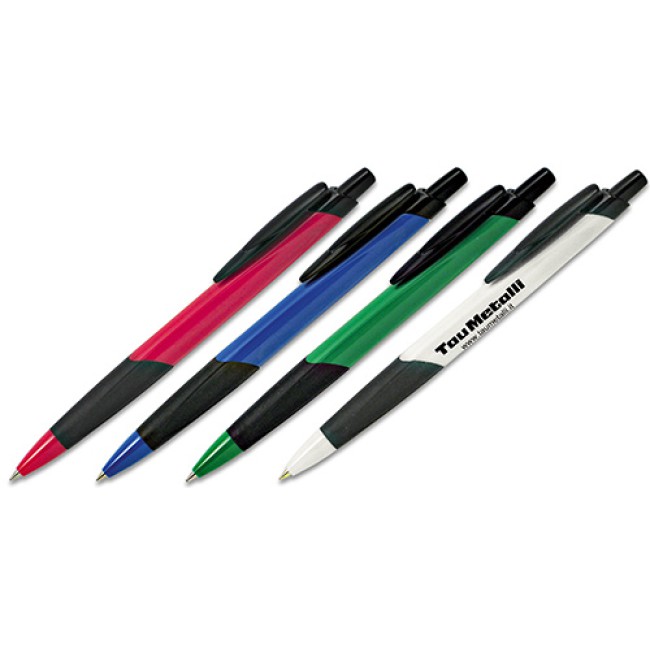 Penna sfera a scatto fusto in plastica rossa clip nera impugnatura in gomma nera refil nero