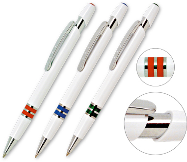 Penna sfera con fusto in plastica bianca, arricchita da anelli colorati e cromati. Dotata di refil documental con inchiostro nero, è confezionata in polybag per una presentazione elegante e pratica.