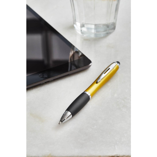 Penna a sfera in ABS capacitiva, compatibile con schermi touch, caratterizzata da un corpo colorato e un'impugnatura in gomma per una presa comoda. Dotata di refill nero, è ideale per chi cerca un prodotto versatile e pratico per scrivere e interagire con dispositivi touchscreen.