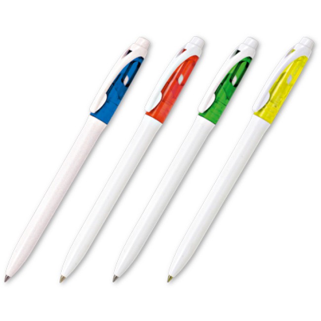 Penna sferaa rotazione, fusto bianco, parte superiore colorata trasparente, clip bianca. Refil blu.