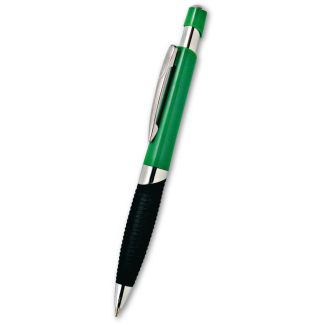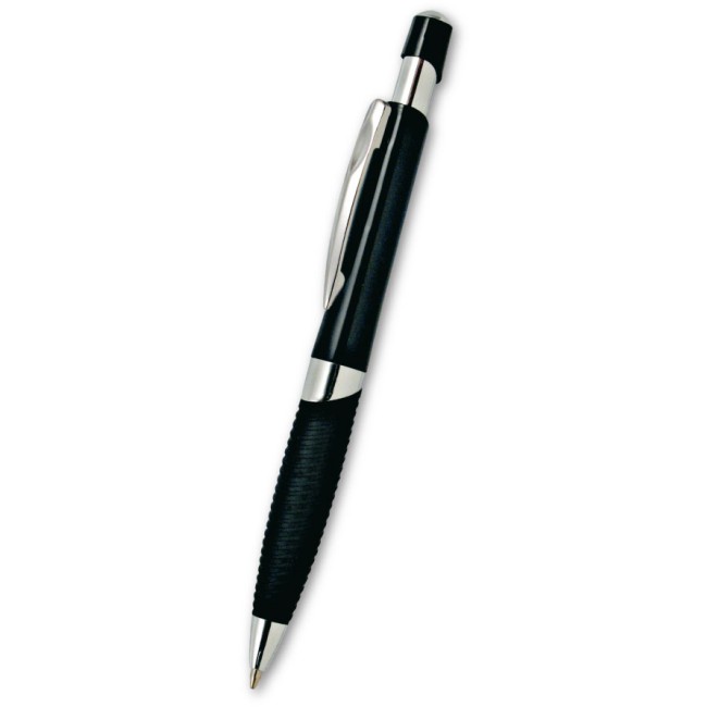 Penna sfera fusto in plastica, impugnatura gomma nera, particolari cromati. Refil blu.
