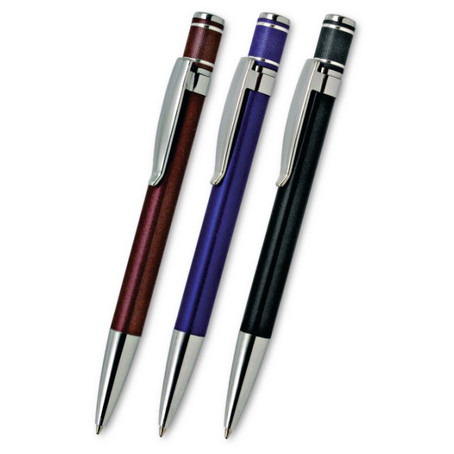 Penna sfera fusto in alluminio colorato, clip cromata, refil nero a triplice carica. Confezione in polybag.